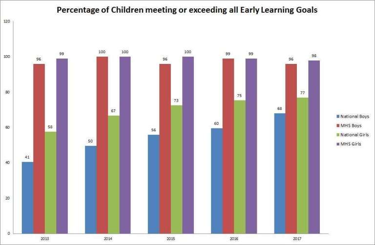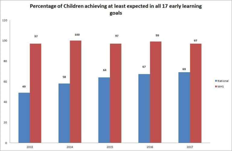 Nationally, Reading, Writing and Numbers continue to be the three goals with the lowest percentage meeting or exceeding the Early Learning Goals. However, The MHS cohort achieved 94% in Reading and Writing and 100% in Numbers.