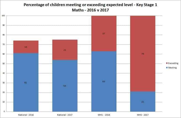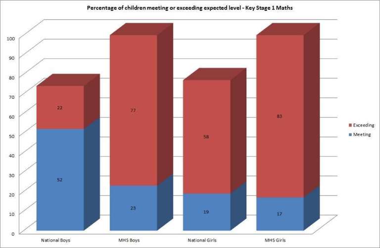 The performance gap in Maths is reversed with 83% of girls exceeding the expected levels against 77% percent of boys.
