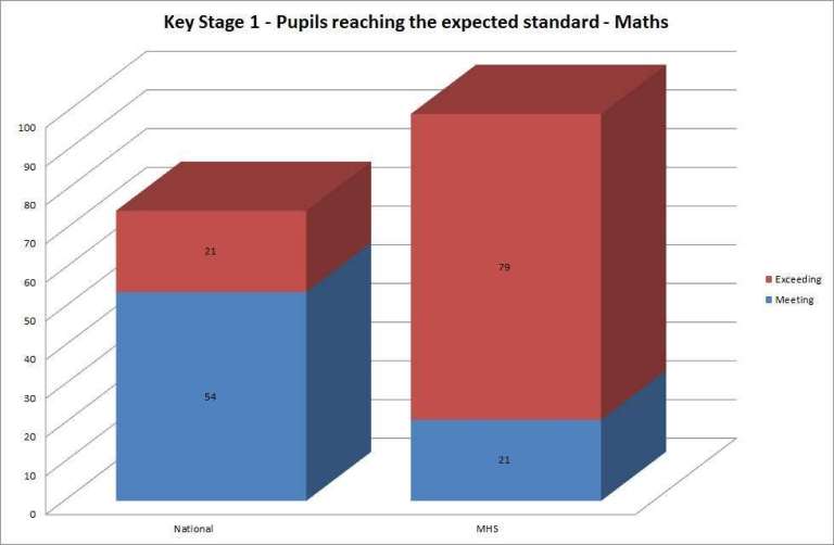 For Maths, the National result is 54% of pupils meeting the expected levels and 21% of pupils exceeding the expected levels. 21% of Mulberry House pupils meet the expected level with 79% exceeding the expected levels.
