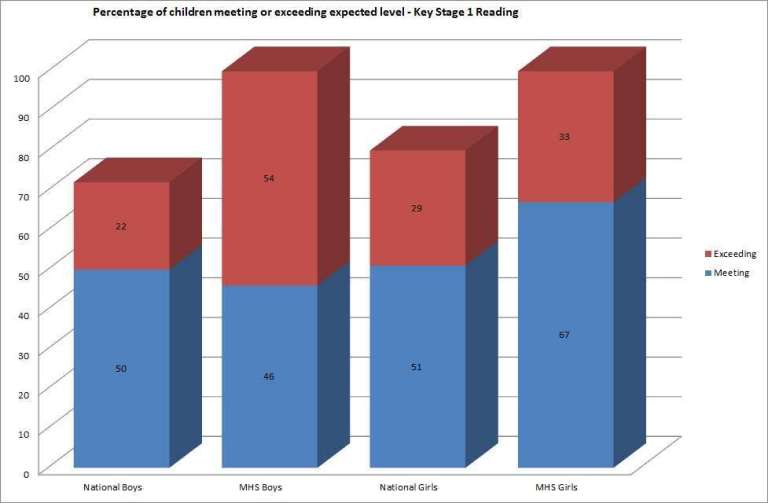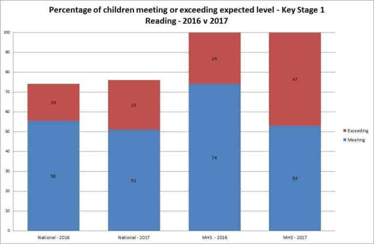 The 2016-17 Cohort differed from National trends, with 54% of boys exceeding the expected levels of Reading against 33% of girls.