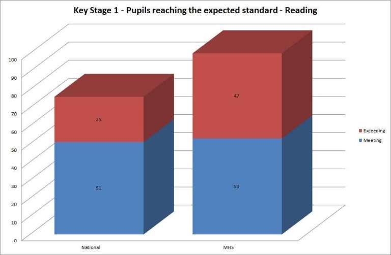 For Reading the National result is 51% of pupils meeting the expected levels and 25% of pupils exceeding the expected levels. 53% of Mulberry House pupils meet the expected level with 47% exceeding the expected levels.