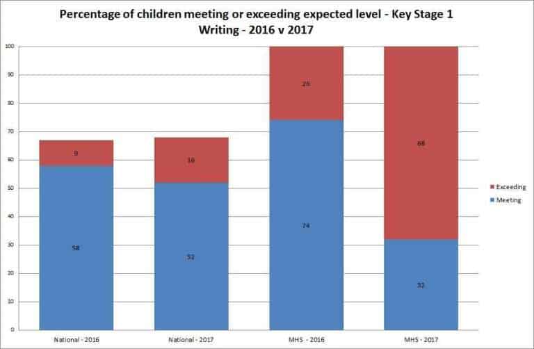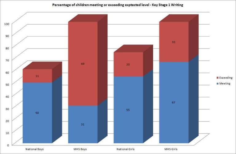 Again with writing, thew cohort differed from National trends, with 69% of boys exceeding the expected levels of Writing against 33% of girls.