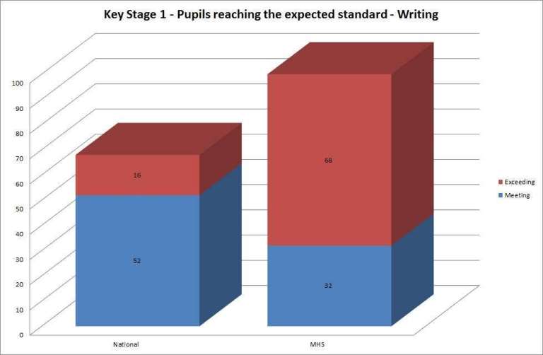 For Writing, the National result is 52% of pupils meeting the expected levels and 16% of pupils exceeding the expected levels. 32% of Mulberry House pupils meet the expected level with 62% exceeding the expected levels.