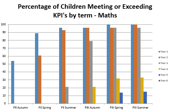 From the start of year 1, 54% of the cohort achieved the outcomes for year 1 in Maths. By the end of year 2, 100% of the cohort achieved the outcomes for year 1 and 2 in Maths with 95% of pupils achieving the outcomes for year 3. 33% of the cohort also achieved the outcomes for year 4 and 15% of the cohort achieved the outcomes for year 5.