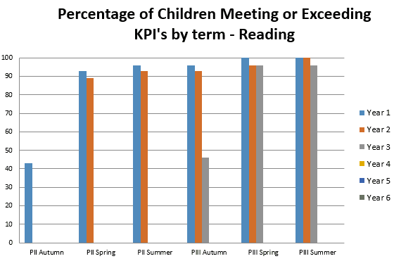 From the start of year 1, 43% of the cohort achieved the outcomes for year 1 in Reading. By the end of year 2, 100% of the cohort achieved the outcomes for year 1 and 2 in Reading with 96% of pupils achieving the outcomes for year 3.