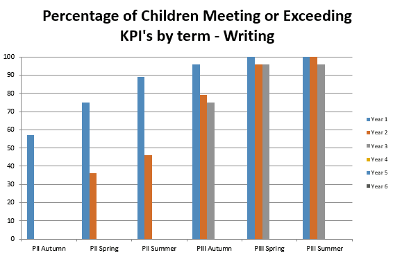 From the start of year 1, 57% of the cohort achieved the outcomes for year 1 in Writing. By the end of year 2, 100% of the cohort achieved the outcomes for year 1 and 2 in Writing with 96% of pupils achieving the outcomes for year 3.