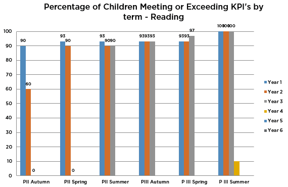 From the start of year 1, 90% of the cohort achieved the outcomes for year 1 in Reading and 60% of the cohort achieved the outcomes for year 2. By the end of year 2, 100% of the cohort achieved the outcomes for year 1, 2 and 3 in Reading with 10% of pupils achieving the outcomes for year 4.