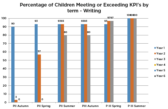 From the start of year 1, 90% of the cohort achieved the outcomes for year 1 in Writing and 3% of the cohort achieved the outcomes for year 2. By the end of year 2, 100% of the cohort achieved the outcomes for year 1, 2 and 3 in Writing.